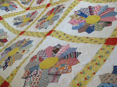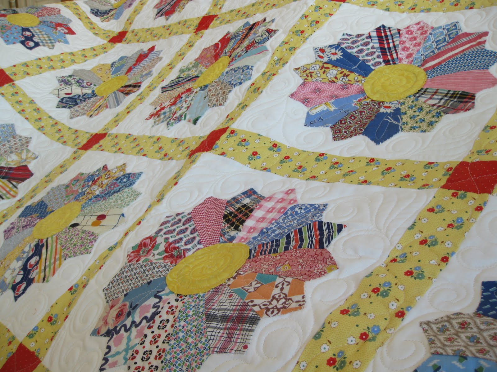 My grandmother had sewn some of the dresden plates onto squares of muslin, but not all, so my mother carefully unattached them, sewed all the plates onto new cotton, and finished the quilt top. She just had the top machine quilted and will soon finish the binding.