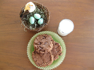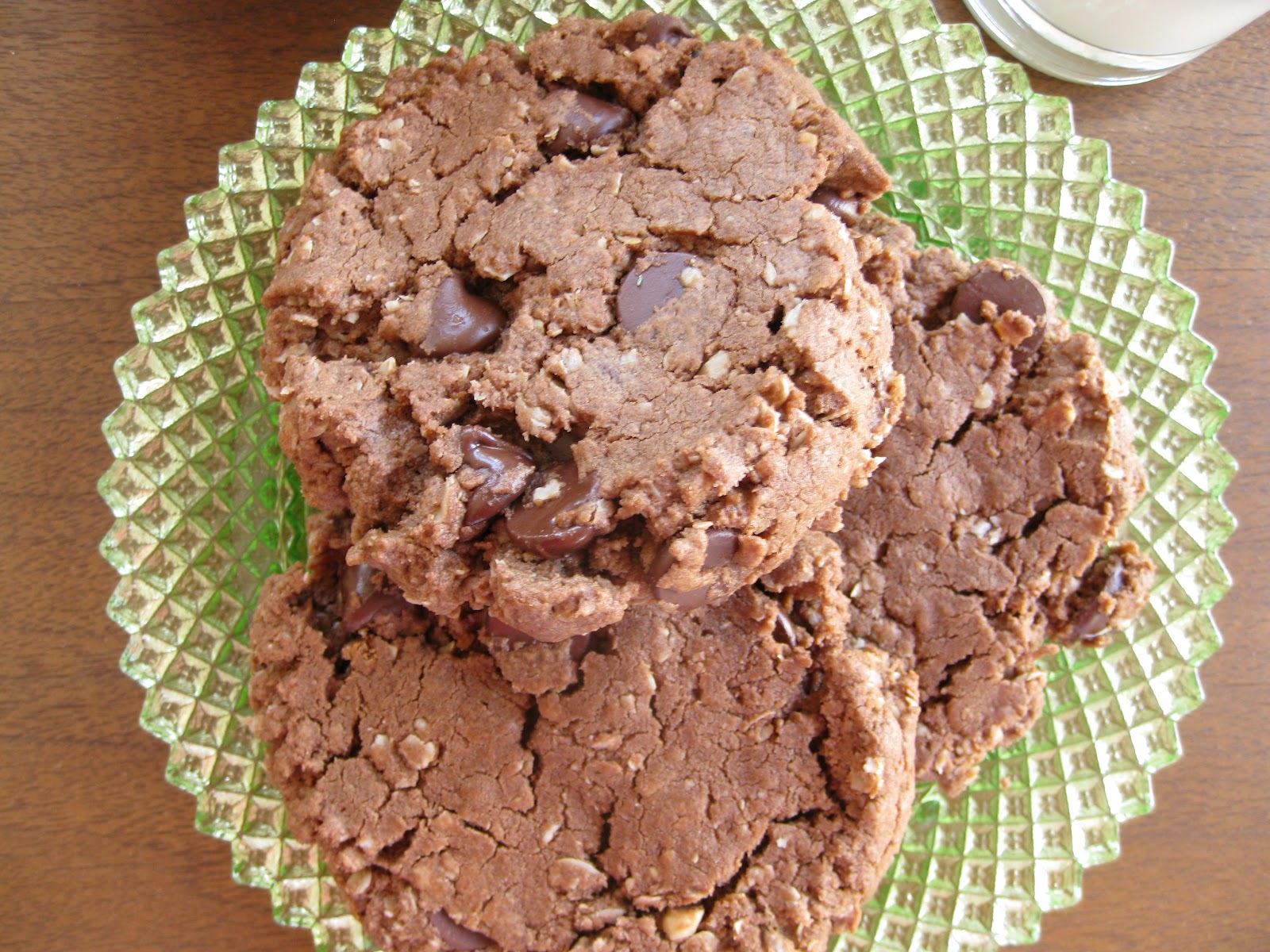 Cream butter, sugars and peanut butter in large bowl until light and fluffy. Blend in eggs and vanilla. In a separate bowl, combine flour, cocoa powder, baking soda and salt. Slowly add flour mixture to butter mixture, mixing in well. Stir in oats and chocolate chips. Dough will be quite stiff.