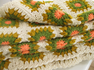 | Isn’t this afghan amazing? My Grandmother Mangum crocheted it in the 70’s and I’m BLOWN AWAY at the warm memories this blanket evoke in me and now as an adult, how brilliant her color combinations are! That super crazy brilliant pop of neon coral/peach against the dark green and olive green. LOVE that this afghan is crocheted in a wool blend and that it has retained it’s shape and texture. LOVE IT!